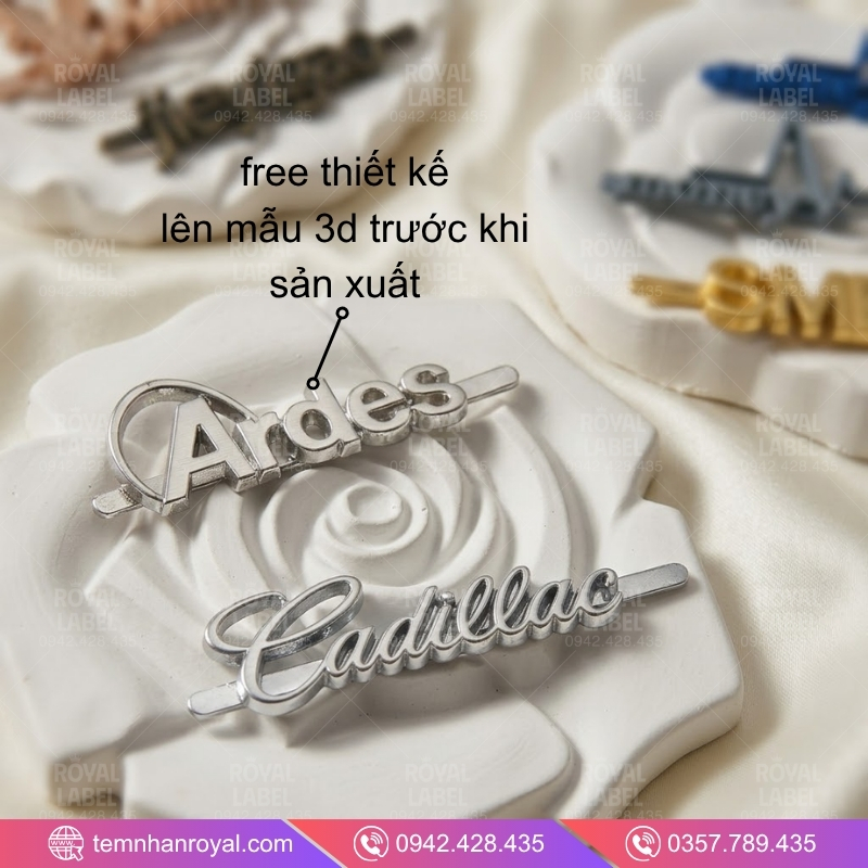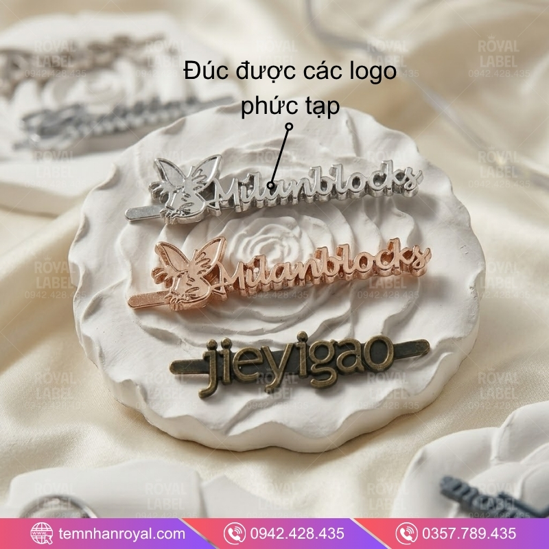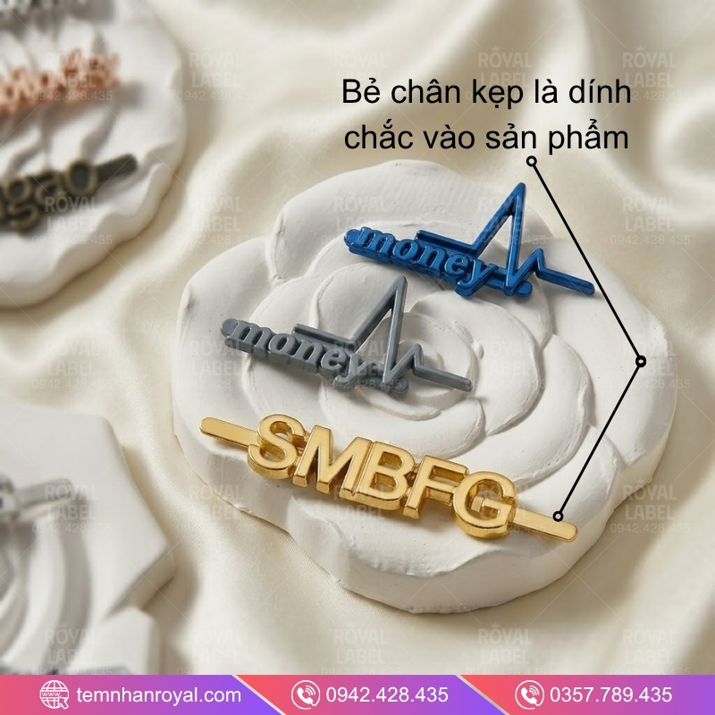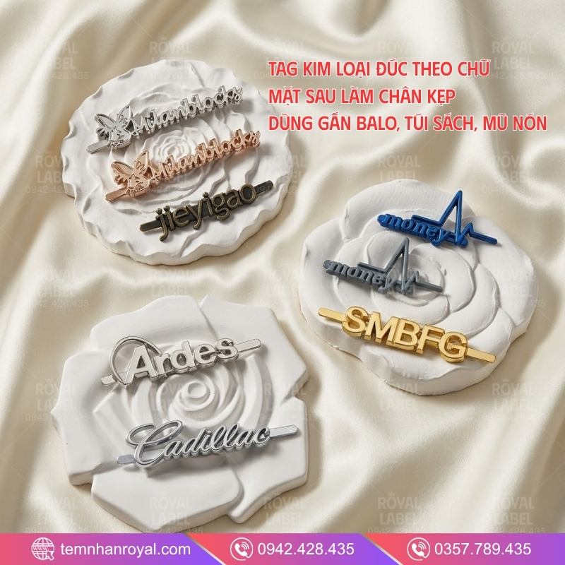 Tem Nhãn Royal cung cấp tem kim loại đúc theo chữ mặt sau chân kẹp cho túi xách, balo, ví da. Hợp kim kẽm cao cấp, 35 màu mạ. Nhận đơn từ 200c - 150.000c.